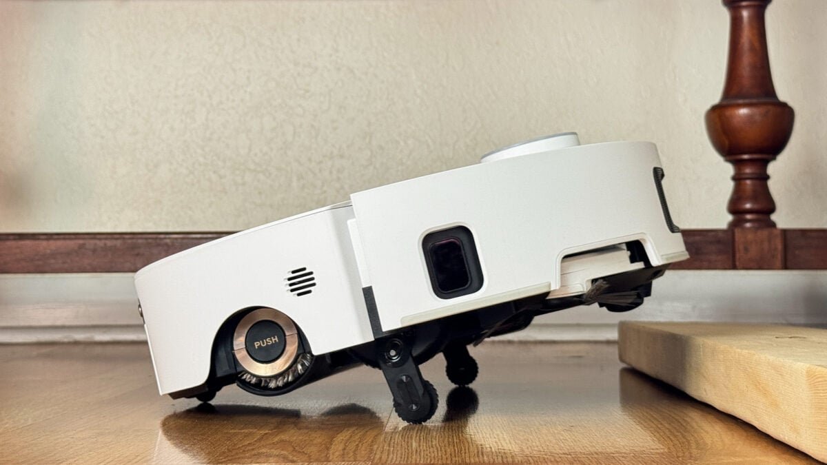 The Dreame Aqua10 Ultra Roller is a big white circle that stands tall, at 3.84 inches, or 4.72 inches with its sensor array extended. Where it differs from a lot of robot vacuums is all those robotic parts serving different purposes. It’s fun watching the sensor array lower until it’s flush with the body to get under my couch, and it’s satisfying to see the mop roller slide out to follow the contours of furniture. Same goes for the side brush, when it pops out to slap dust out of corners its big disc shape would otherwise make difficult to reach.